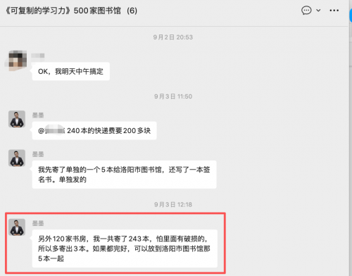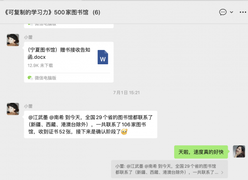 11月5日晚,《可复制的学习》图书馆公益捐赠项目负责人小蕾,在工作群里发了4个图书馆地址,并安排人寄书。随后,她说:“560家完成啦,项目可以结束了吗?”