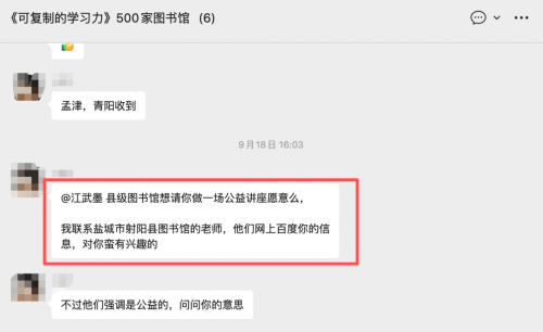 此外,在联系图书馆的过程中,有一些负责人看完《可复制的学习力》的内容后,想联系作者去做讲座。